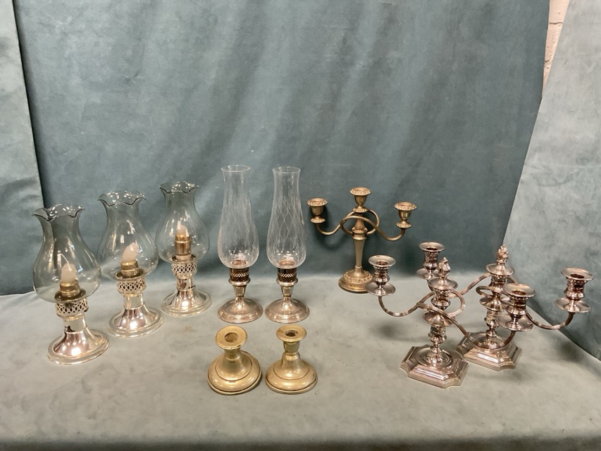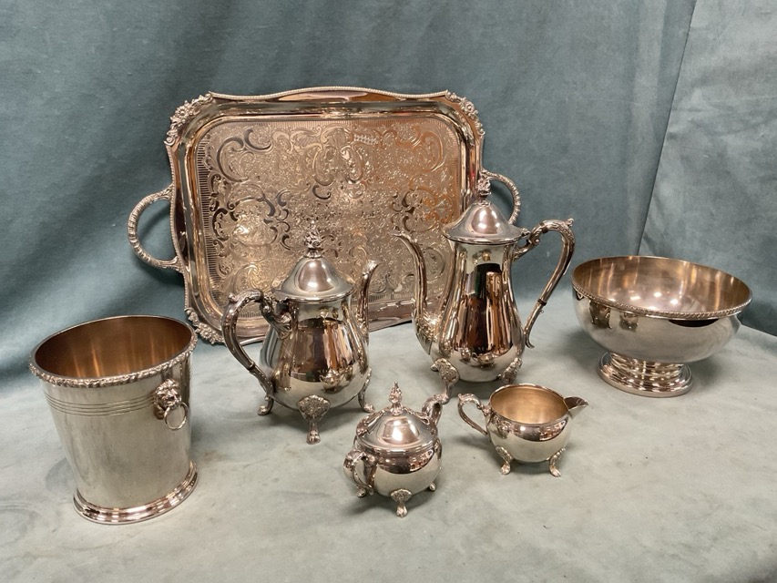 A quantity of silver plate - a foliate engraved drinks tray, a four-piece teaset, a pair of candelabra, an ice bucket, candlesticks, a rose bowl, etc. (A lot)
