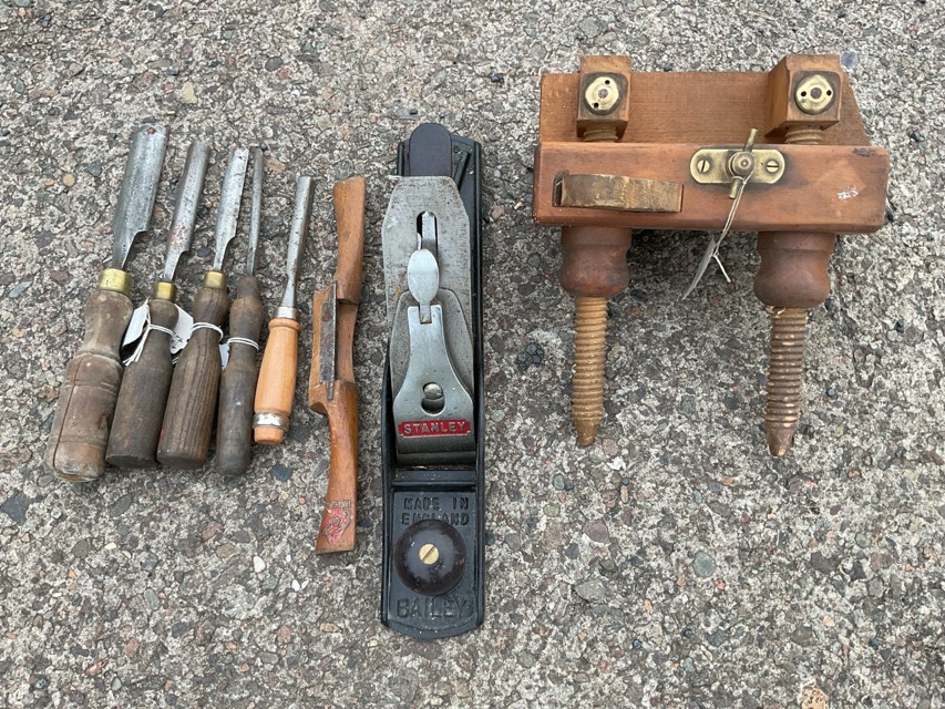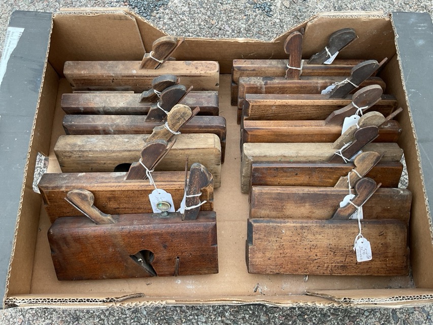 A collection of Victorian moulding planes - eight marked F.Colledge, a Dado, a right-hand snipe-bill, a Jack, a plough by Emir, etc; and other carpentry tools - chisels & a spokeshave, etc. (21)