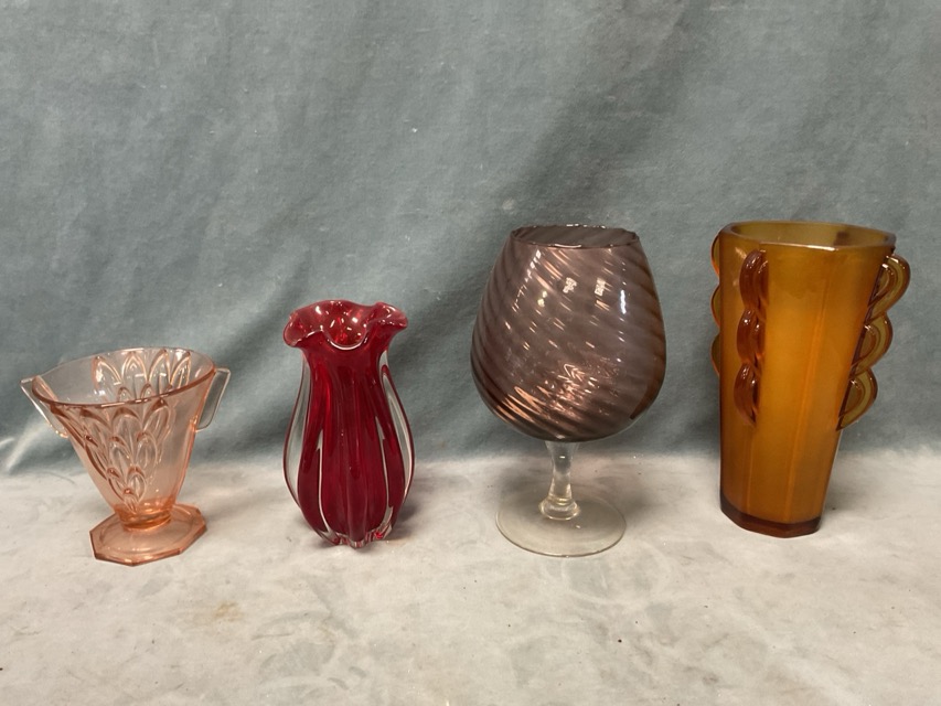 Fifteen miscellaneous glass vases - deco, tall cut, brandy balloon shape, coloured, Dartington, mottled, etc. (15)