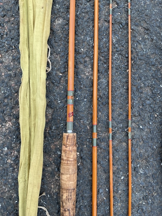 An 8ft three-piece Ebisu split-cane fly rod with additional piece; a 14ft three-piece fibreglass Rob Wilson fishing rod; and a 7ft fibreglass Albatross Holglas spinning rod. (3)