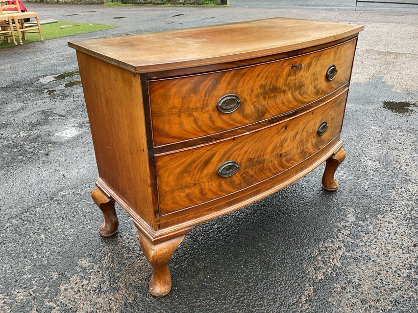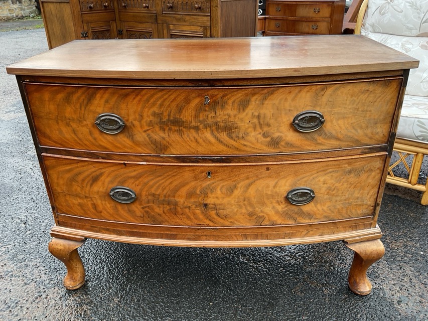 A satinwood crossbanded bowfronted mahogany chest of two long cockbeaded drawers, raised on cabriole legs. (21.75in x 43.5in x 32.5in)