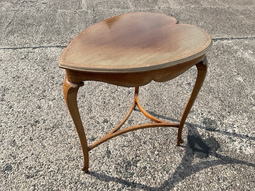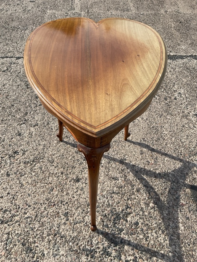 A heart shaped Edwardian mahogany occasional table with crossbanding to moulded top, raised on three cabriole legs - all decorated with boxwood inlay. (25.5in x 19.5in x 28.5in)