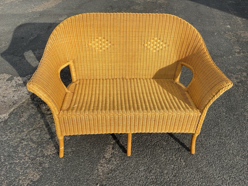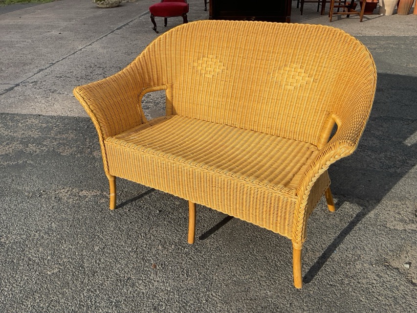 A cane sofa with rounded arched back and outswept arms raised on turned legs, the back woven with two diamond shaped lozenge panels. (48in)