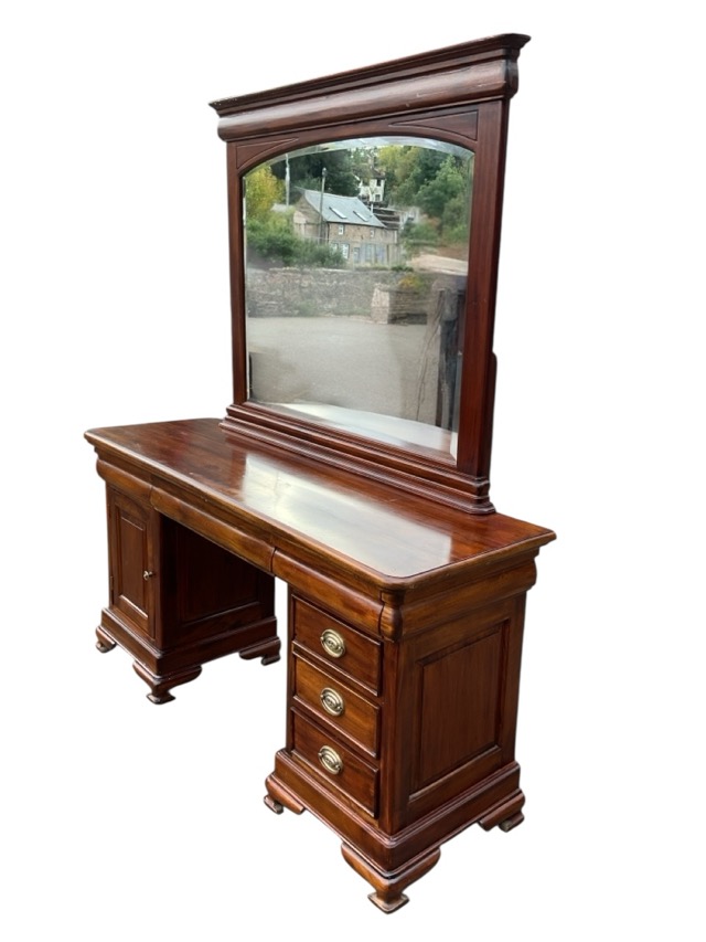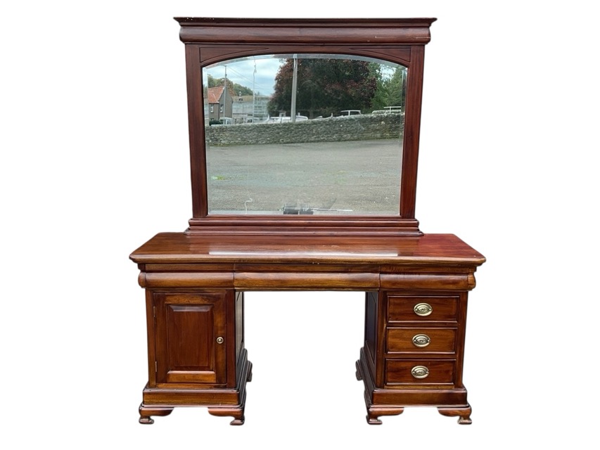 A mahogany dressing table with arched bevelled mirror back above a rectangular top with three cushion moulded frieze drawers, raised on pedestals with drawers & cupboard on bracket feet. (61in x 19in x 72.5in)