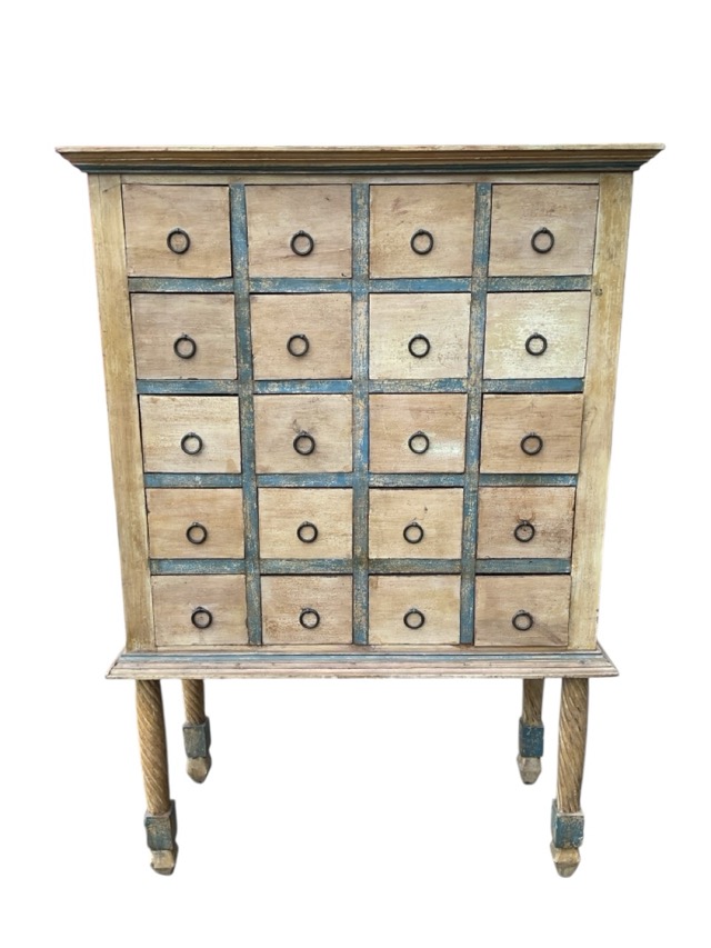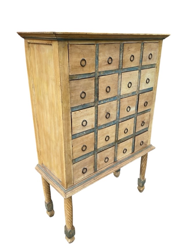 A painted hardwood cabinet on stand, the chest with twenty ring-handled drawers beneath a moulded cornice, raised on twisted turned legs with block feet. (39.25in x 17.25in x 58in)