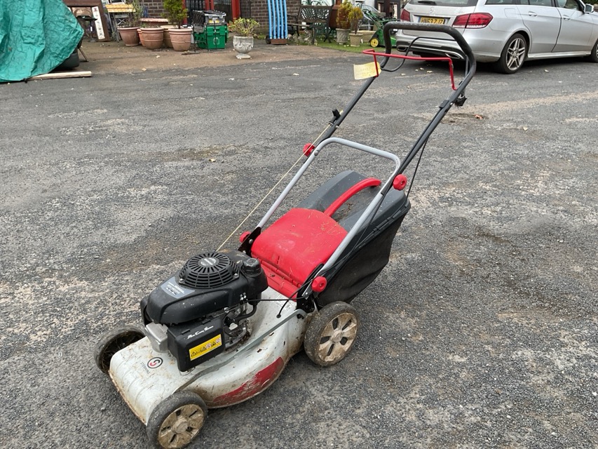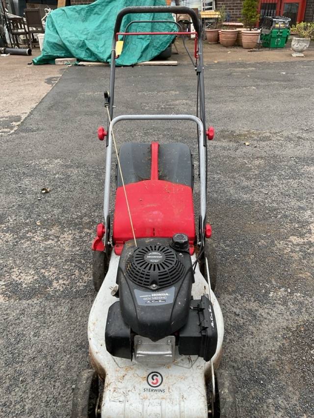 A Sterwins rotary garden mower with Honda easystart auto choke motor, fabric grassbox, adjustable wheels, etc.