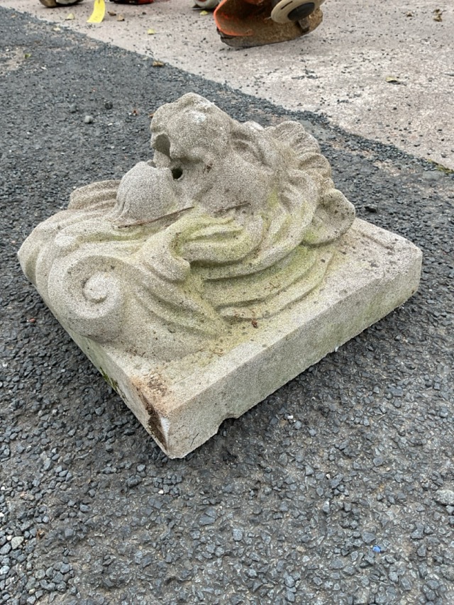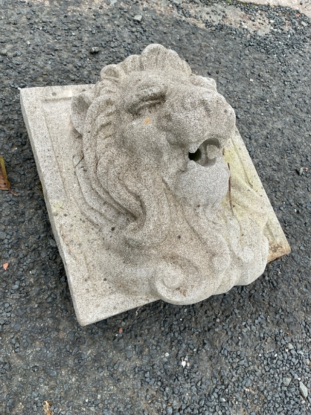 A stone wall spout in the form of a lionhead on square panel. (11.5in x 11.5in)