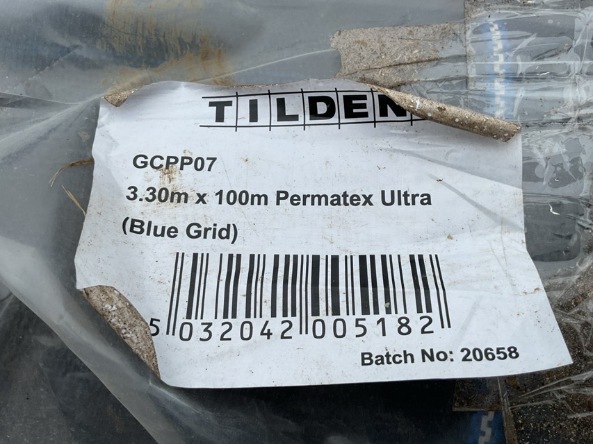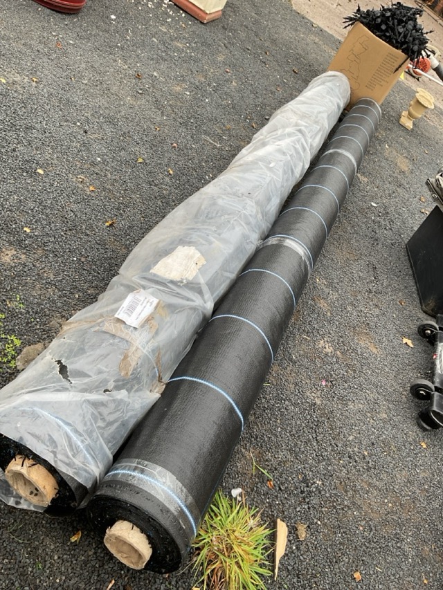 Two unused Tildenet permatex garden ground covering rolls with a large quantity of studded spikes for securing to beds. (3.3m x 100m) (2)