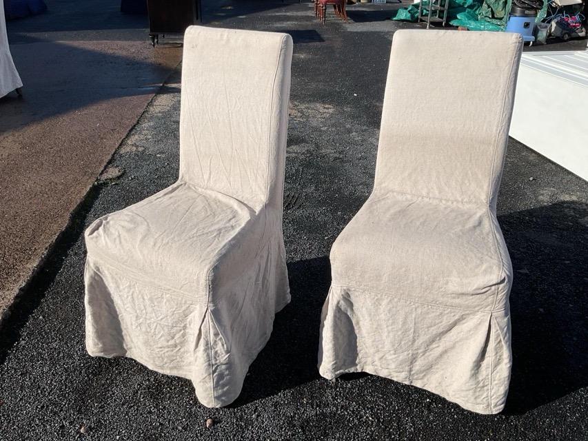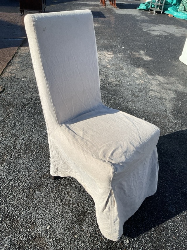A set of six contemporary dining chairs on square tapering ebonised legs with linen loose lace-back covers. (6)