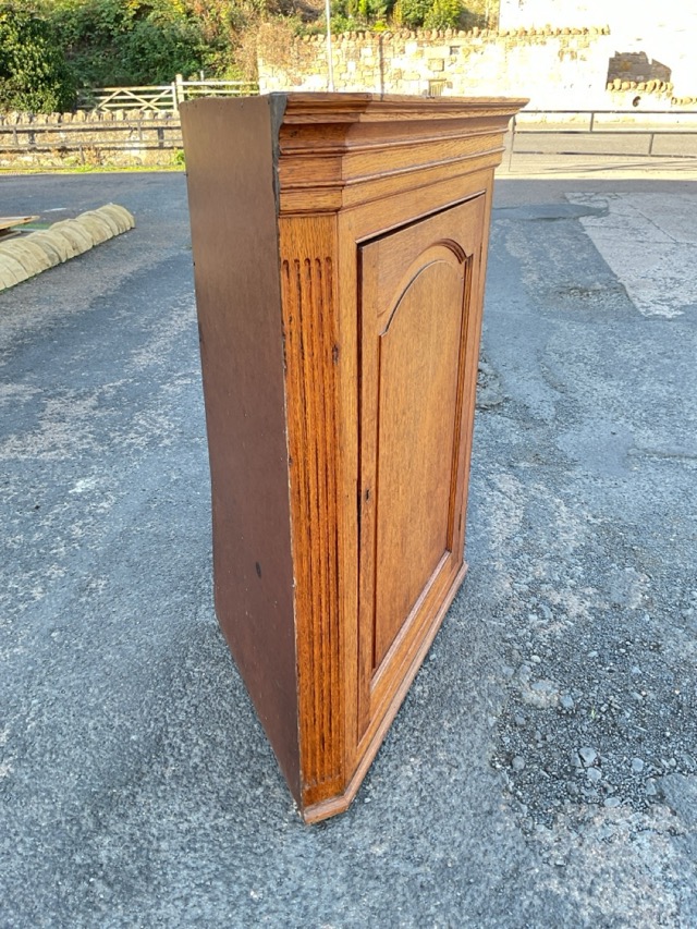 A nineteenth century oak corner cabinet with moulded cornice above an arched fielded panelled door enclosing shaped shelves, framed by fluted canted pillasters. (36in x 20in x 41.5in)