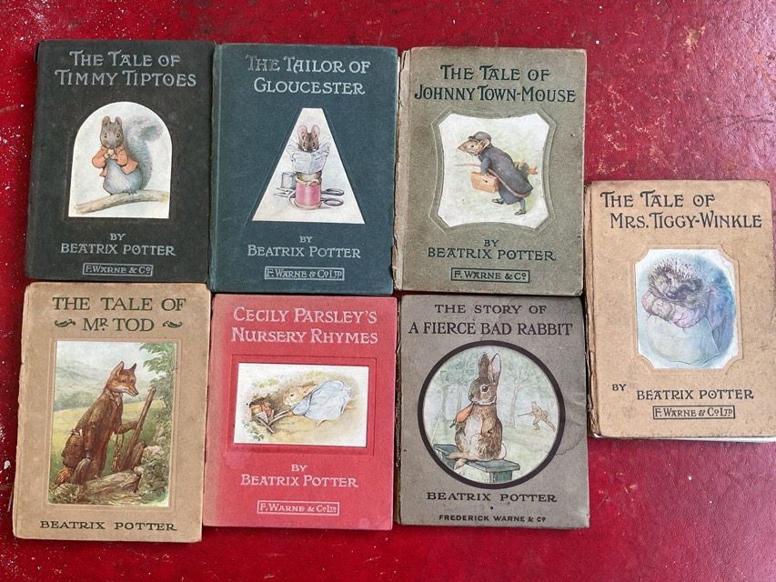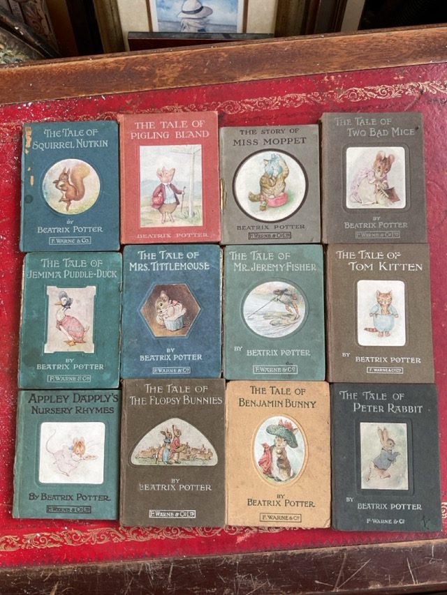 A painted Peter Rabbit bookshelf containing 19 Beatrix Potter volumes published by Frederick Warne & Co - poor well-read condition. (20)
