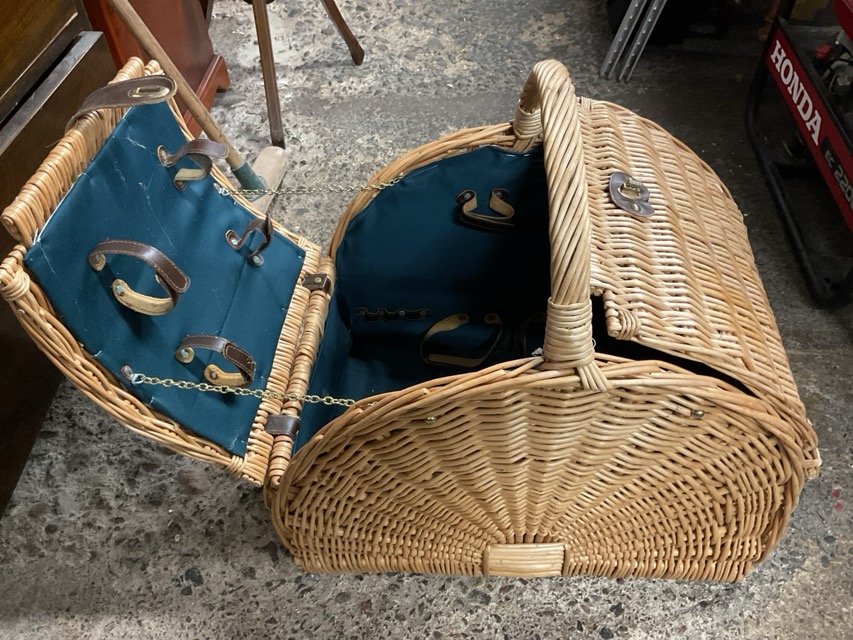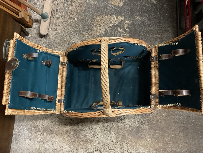 A large cane picnic hamper of arched fan shape with lined interior having leather mounts, the basket with twisted loop handle. (20in x 20in)