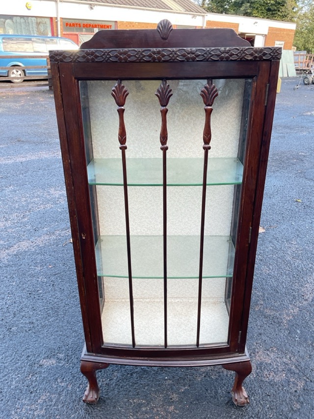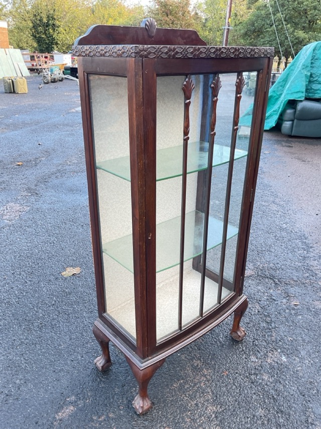 A mahogany glazed display cabinet, the top with shaped back and blind fretwork above a door with leaf carved bars, raised on cabriole legs with ball-and-claw feet. (24.25in x 13in x 52.25in)