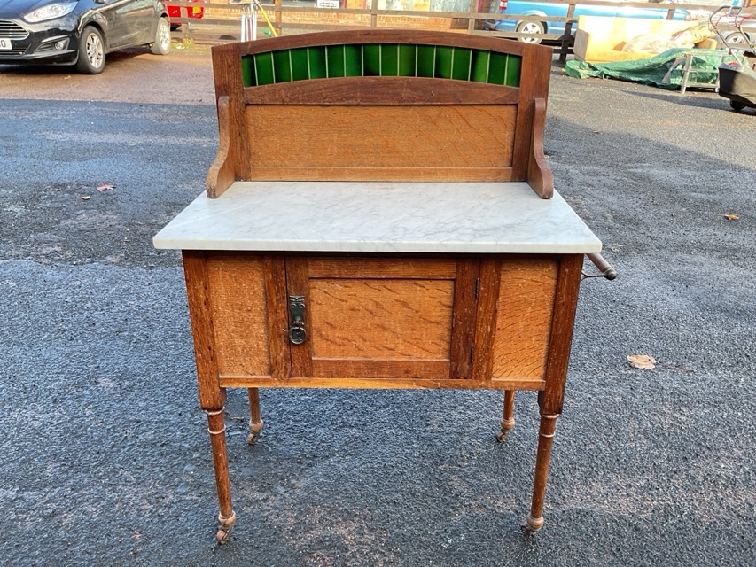 An art nouveau oak washstand, the back with arched tiled panel above a marble slab, the base with panelled cupboard, raised on turned legs with castors. (30.25in x 16.75in x 40.5in)