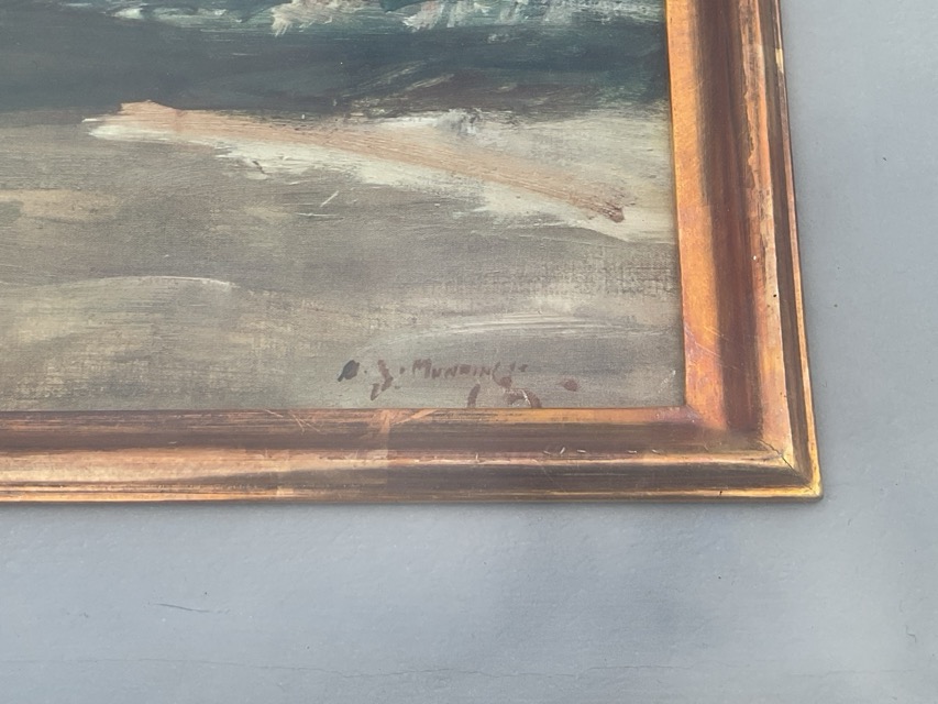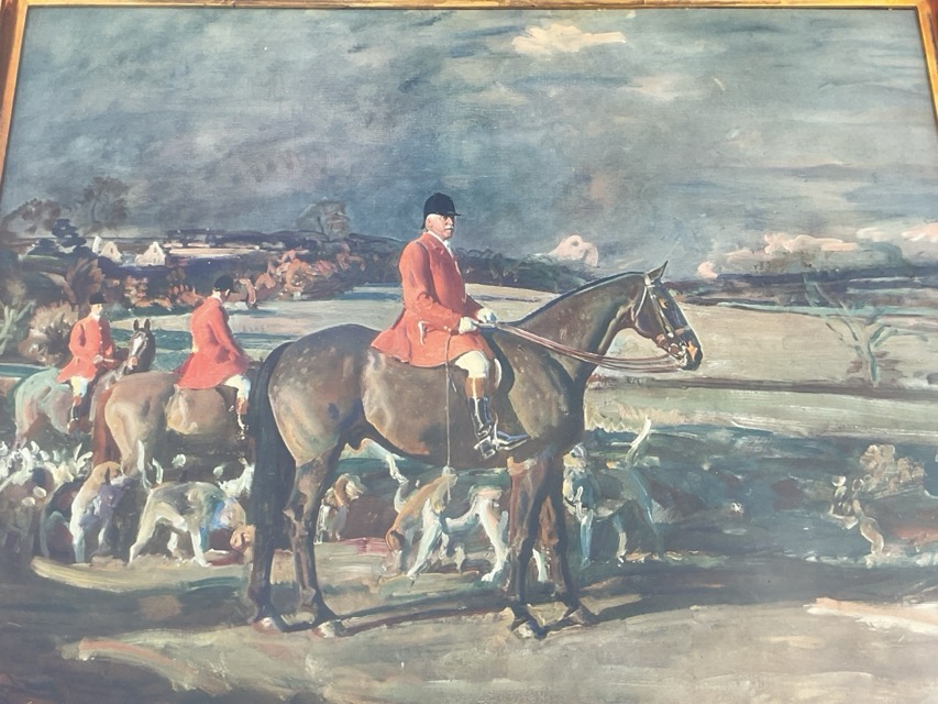 A J Munnings, facsimile print depicting huntsman & hounds in landscape, titled to Frost & Reed label verso Master of the Essex Union, signed in print, mounted & framed. (19.5in x 15in)