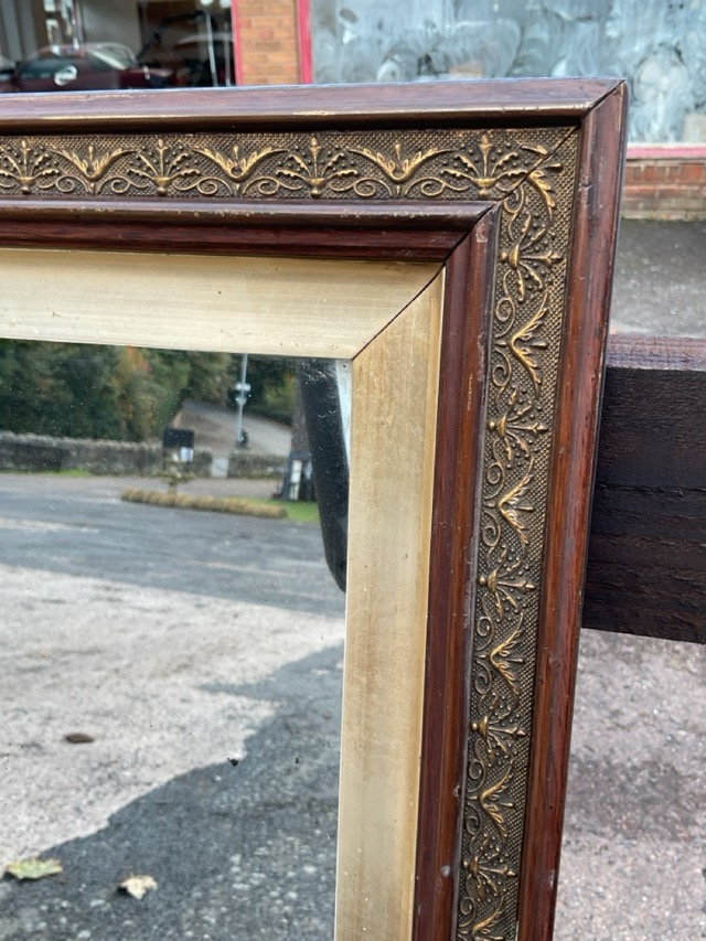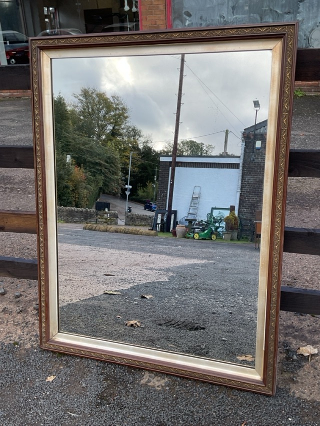 A large Edwardian rectangular mirror in moulded frame with gilt embossed band and silvered slip. (45in x 35in)