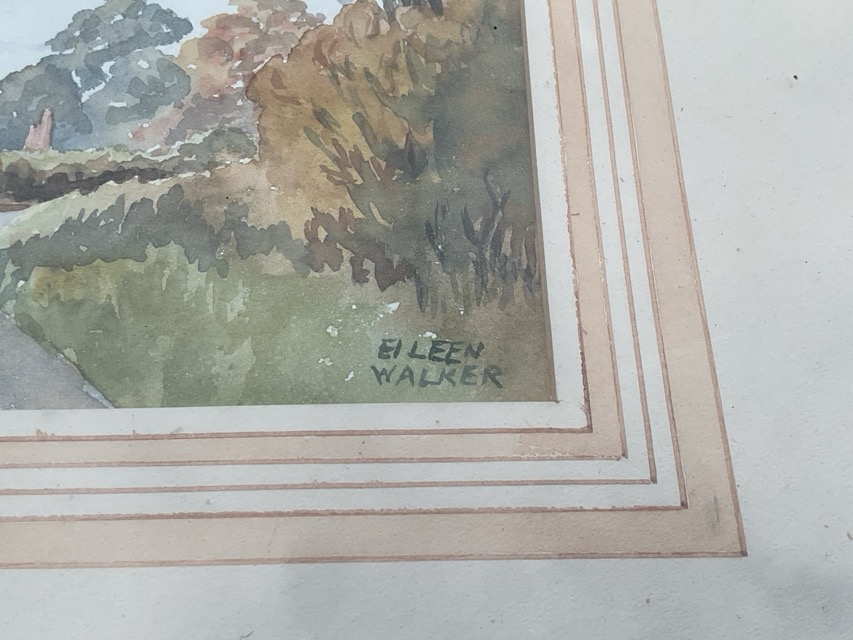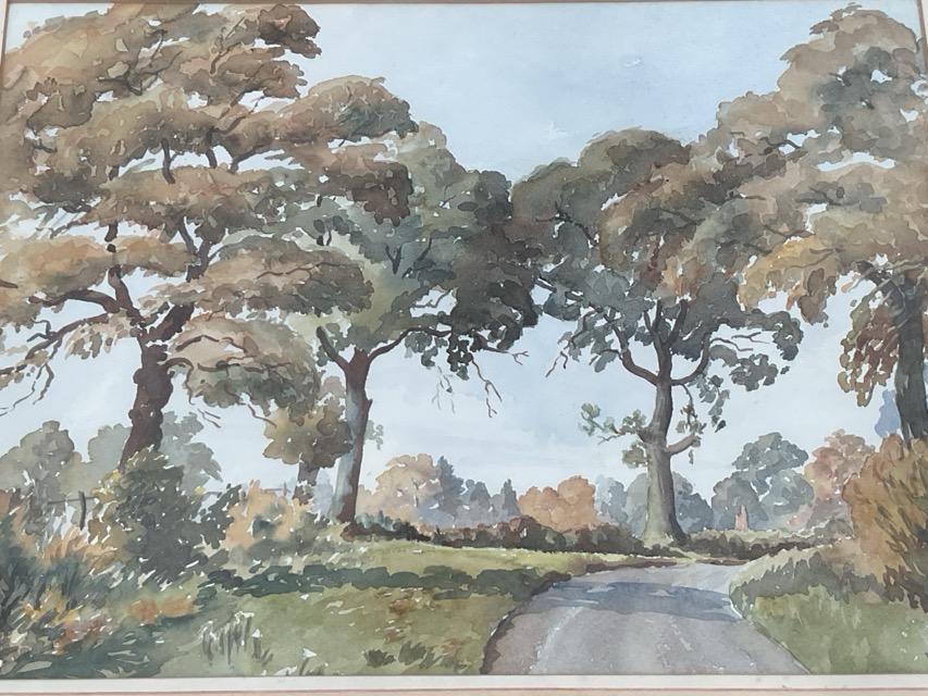 Eileen Walker, watercolour, landscape with trees & road, signed, titled to Essex Art Club label to verso - Winter Sunshine, mounted & framed. (14.25in x 10.25in)