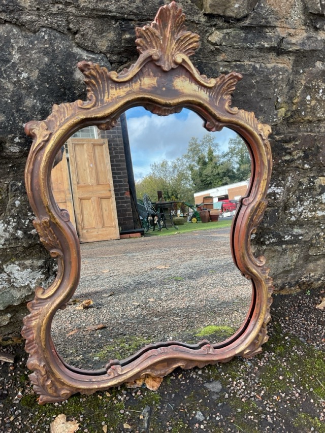 A Georgian style mirror in leaf scrolled burnished gilt waisted frame, surmounted by leaf crest. (19.75in x 26in)