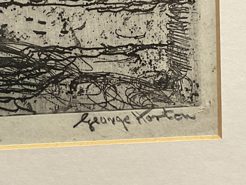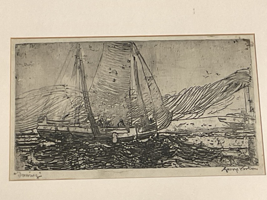 George Horton, aquatint, a fishing vessel under tow by a steam tug, titled Towing, signed in pencil on margin, mounted and gilt framed. (11.5in x 6.5in)
