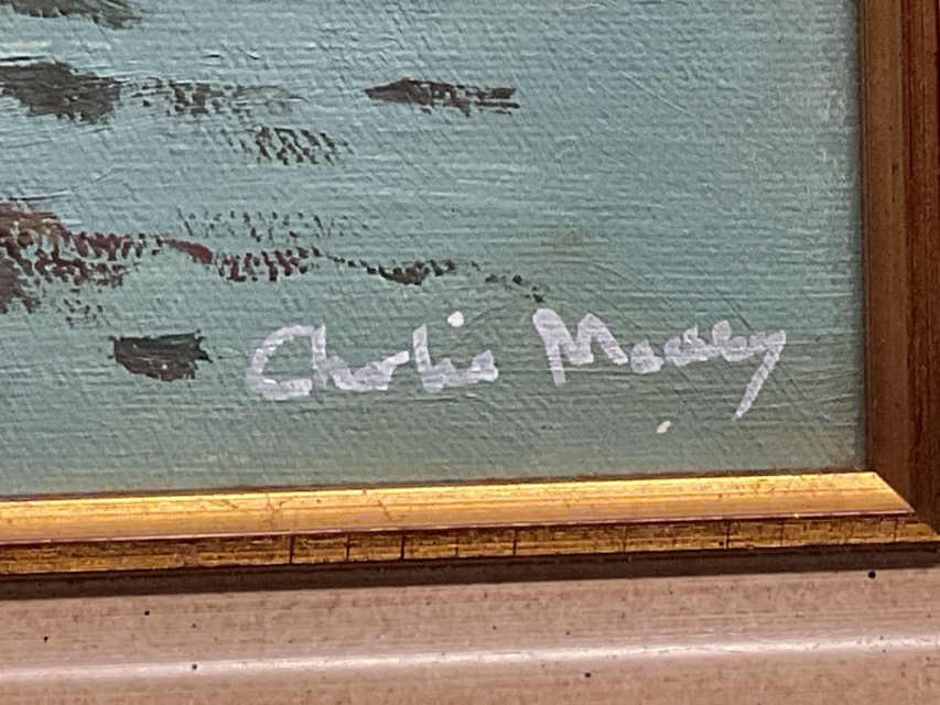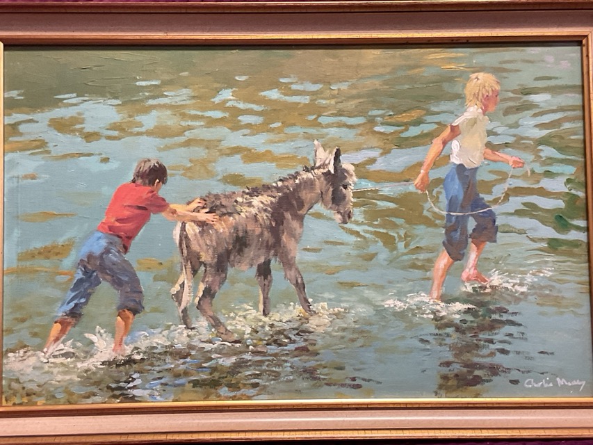 Charlie Mackesy, oil on board, two boys with reluctant donkey in shallow water, signed and framed. (19in x 11.5in)