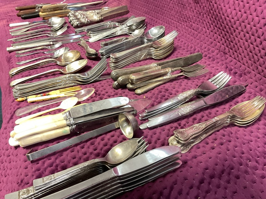 Miscellaneous silver plated, stainless steel, and chromed cutlery - a set of Victorian fruit knives & forks by Elkington, sets and part sets of dessert and soup spoons, dessert, fish, and table knives and forks, carving and kitchen knives, tea knives, Viners, Arthur Price, etc. (A lot)