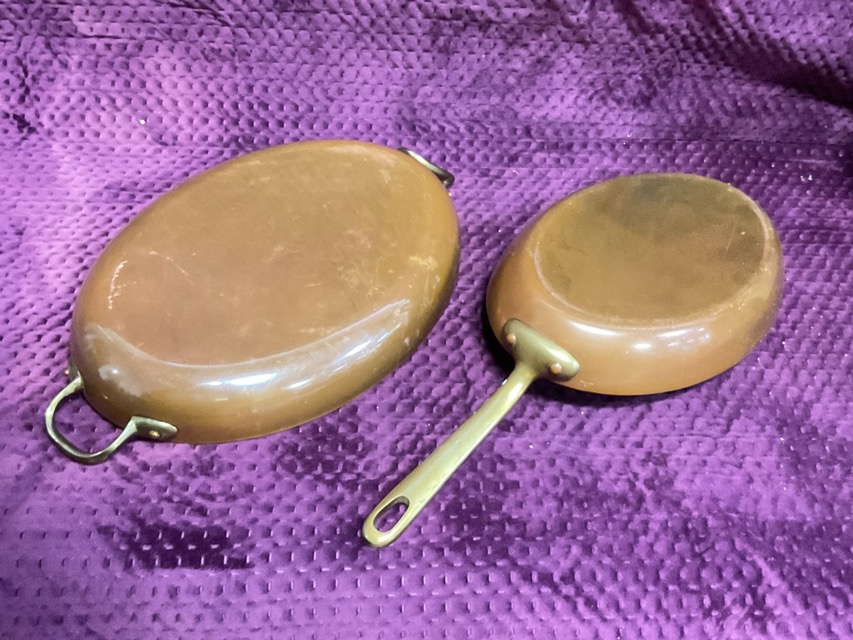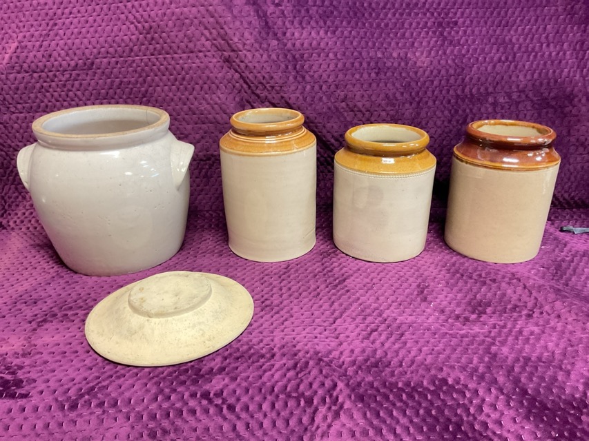 A glazed stoneware covered crock; three stoneware storage jars; a French copper oval pan with riveted brass handle; and a similar oval two-handled gratin dish. (6)