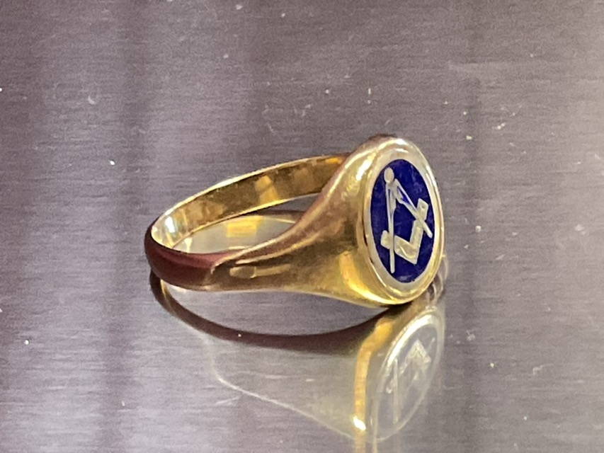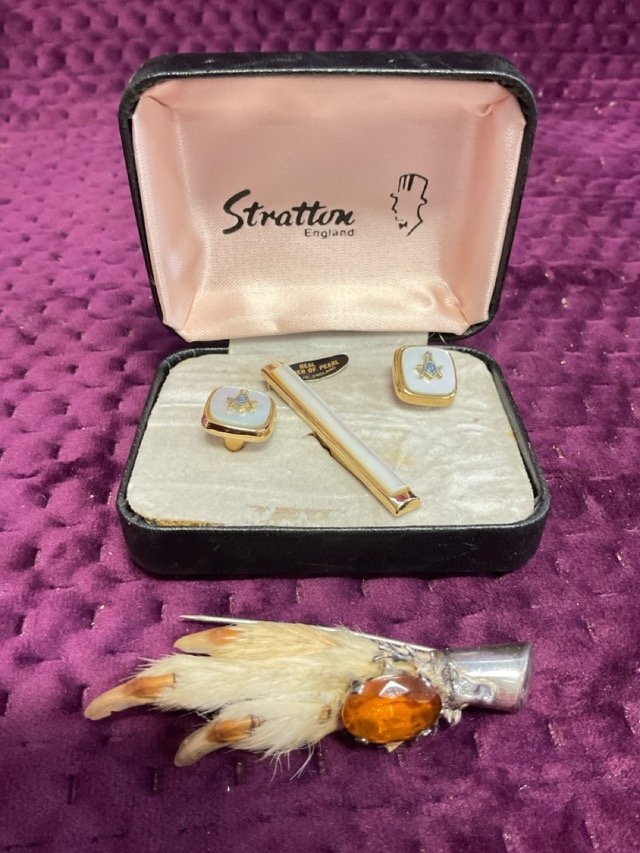 A leather jewellery box containing a hallmarked 9ct gold enamelled masonic signet ring - 6.7g; matching gold plated tie tack and pair of cufflinks; and a grouse foot & faux citrine brooch; and a Stratton boxed set of gold plated and mother-of-pearl cufflinks and tie clip.