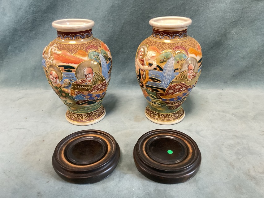 A pair of Japanese Satsuma ovoid vases with relief cast tubelined and handpainted decoration of immortals in a landscape, on turned hardwood stands. (9in) (2)