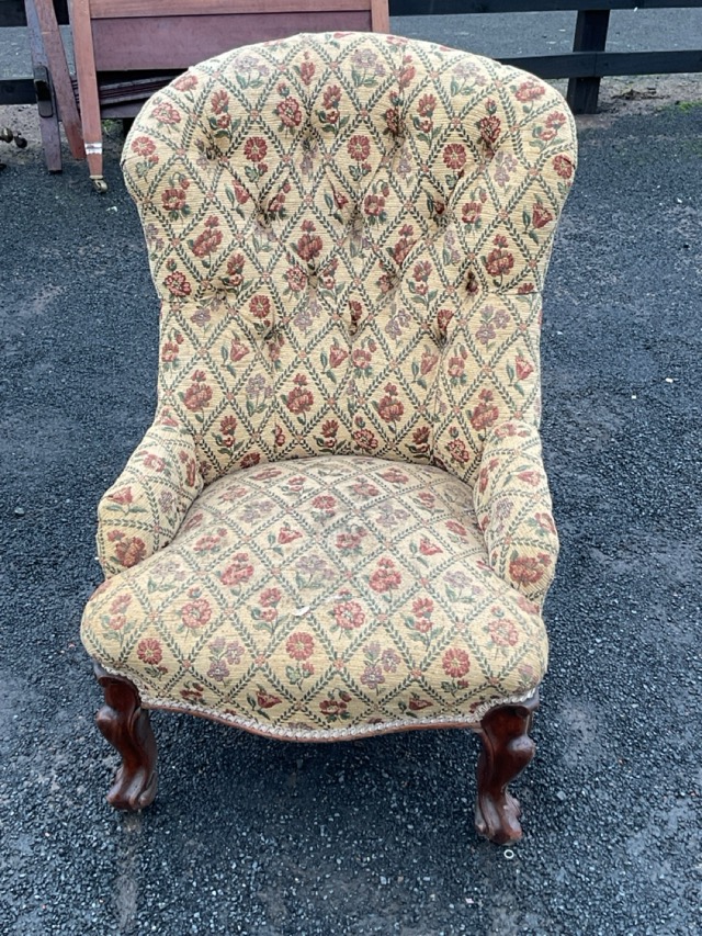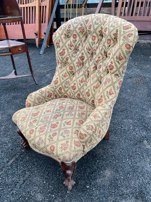 A Victorian upholstered mahogany chair with arched buttoned back above a serpentine fronted seat, raised on carved cabriole legs.