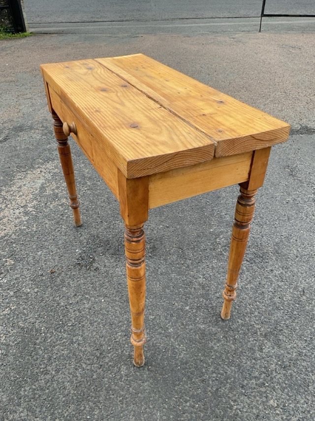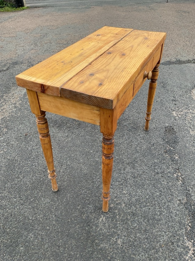 A Victorian pine side table with thick rectangular top above an apron with knobbed frieze drawer, raised on turned tapering legs. (35.25inx 17in x 30in)