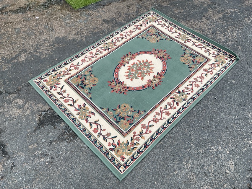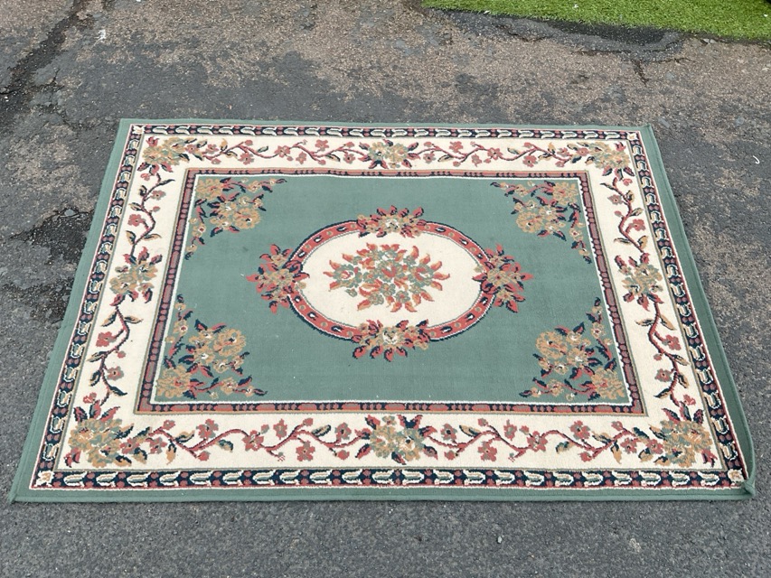 A Victorian style woven rug with floral medallion on a green field within bellflower and meandering flowering vine borders. (47in x 67.5in)