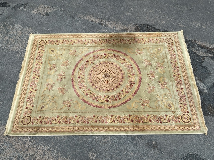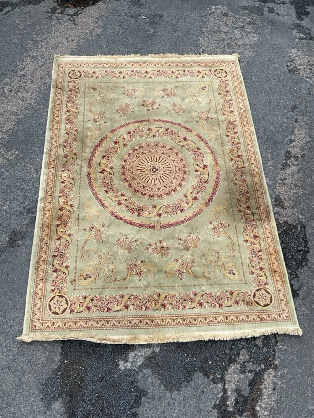 A Savonnerie style rug woven with floral garland medallion on a green field with cornucopia spandrels, framed by ribbon & floral garland border. (62.5in x 93in)