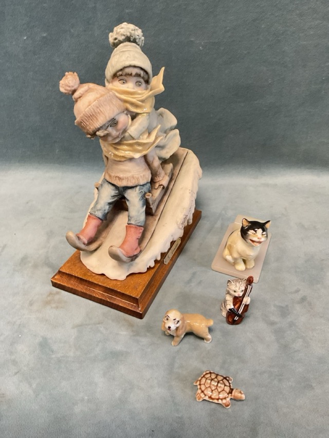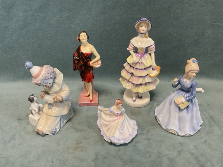A collection of ceramic figures - Royal Doulton Meg HN2743, Carmen HN1267, and Ninette HN3215; a Lladro clown, an Alfretto crinoline lady, a cat on an onyx matchbox holder base, miniature cat, dog and tortoise, and Capodimonte style children on a sledge. (10)