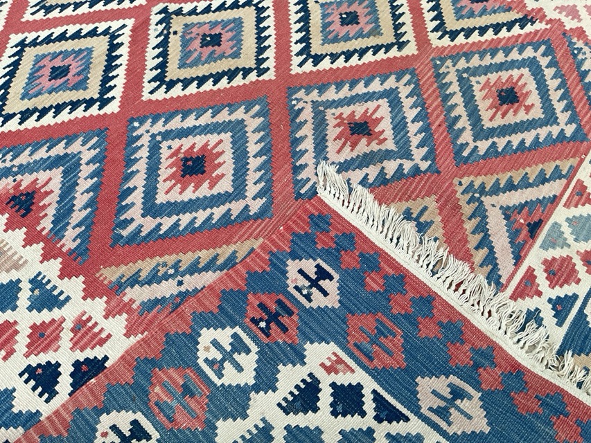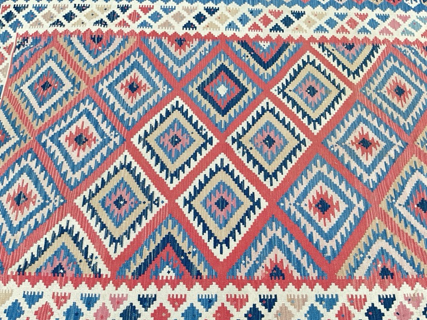 A Fars Qashqai kilim carpet woven with multicoloured zigzag lozenge field within geometric stepped square borders. (71in x 98in)