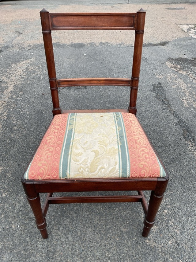 A Georgian mahogany chair with moulded tablet back on turned cylindrical supports above a drop-in upholstered seat, raised on turned tapering legs joined by stretchers.
