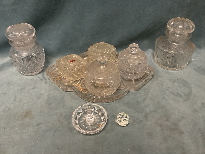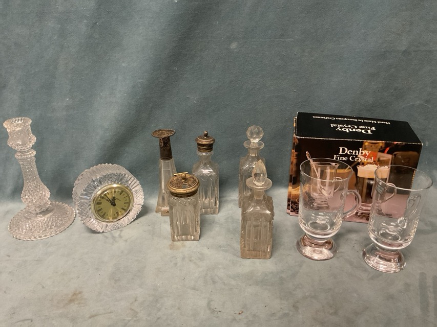 Miscellaneous glass - bowls, jugs, candlesticks, dressing table trays, vases, a bell, cut & moulded, cruet jars & stoppers - some with silver plated mounts, a clock, dessert bowls, a pair of boxed Denby glasses, etc. (A lot)