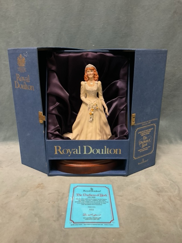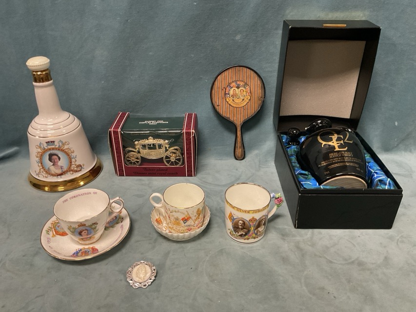 A collection of royal commemorative ceramics - a cased Royal Doulton figurine, tankards, plates, Wade bells, cups & saucers, etc; and various QE2 whiskey flagons & stoppers. (A lot)