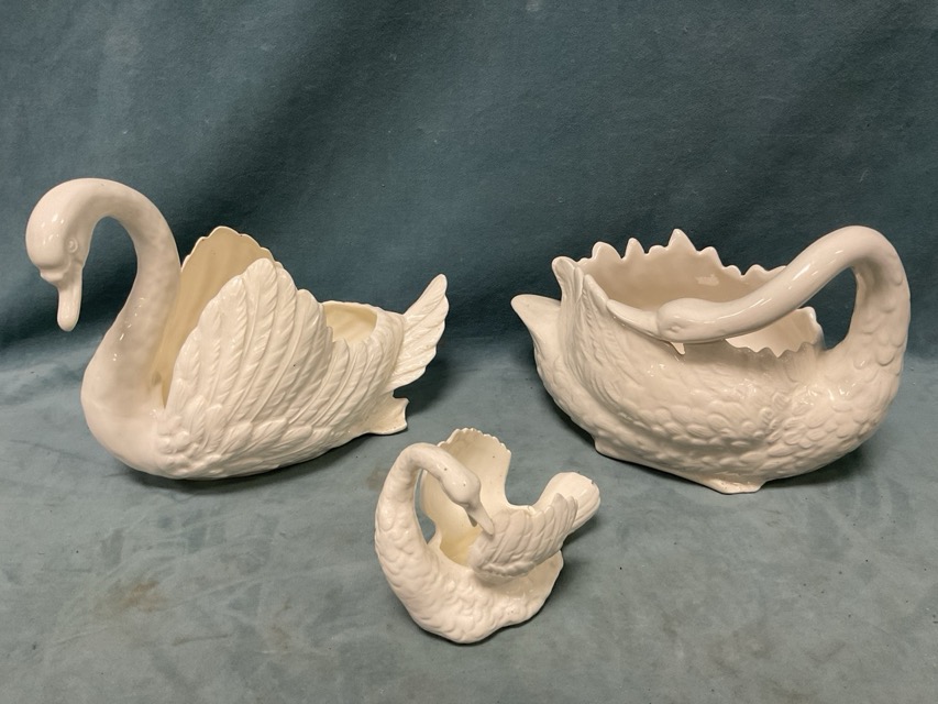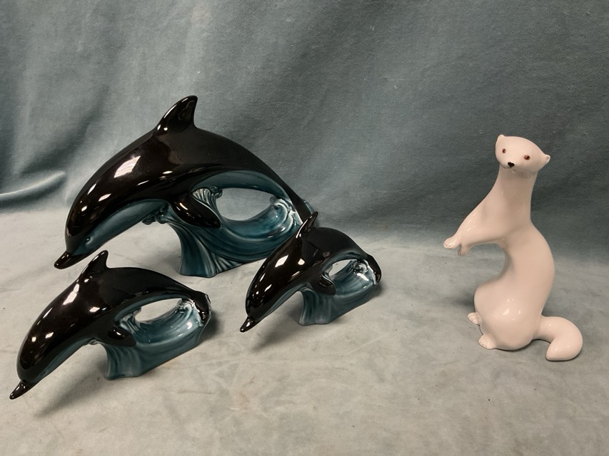 Three graduated Poole Pottery dolphins; four miscellaneous blanc-de-chine swan vases; and a Russian porcelain stoat. (8)