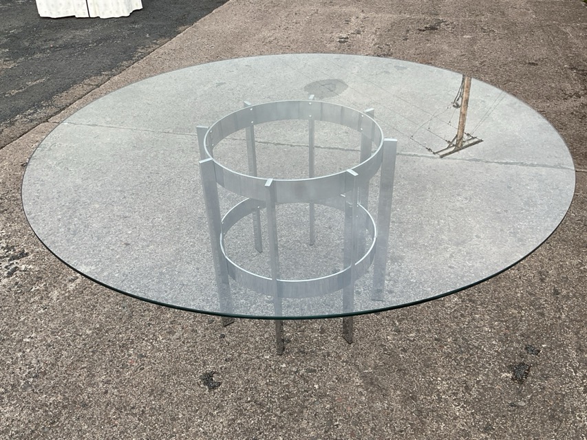 A 70s Merrow Associates dining table by Richard Young, titled The Preece, the glass top raised on cylindrical chromed support with rectangular columns. (66in x 28in)