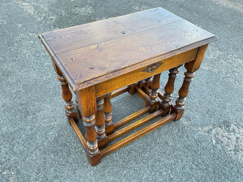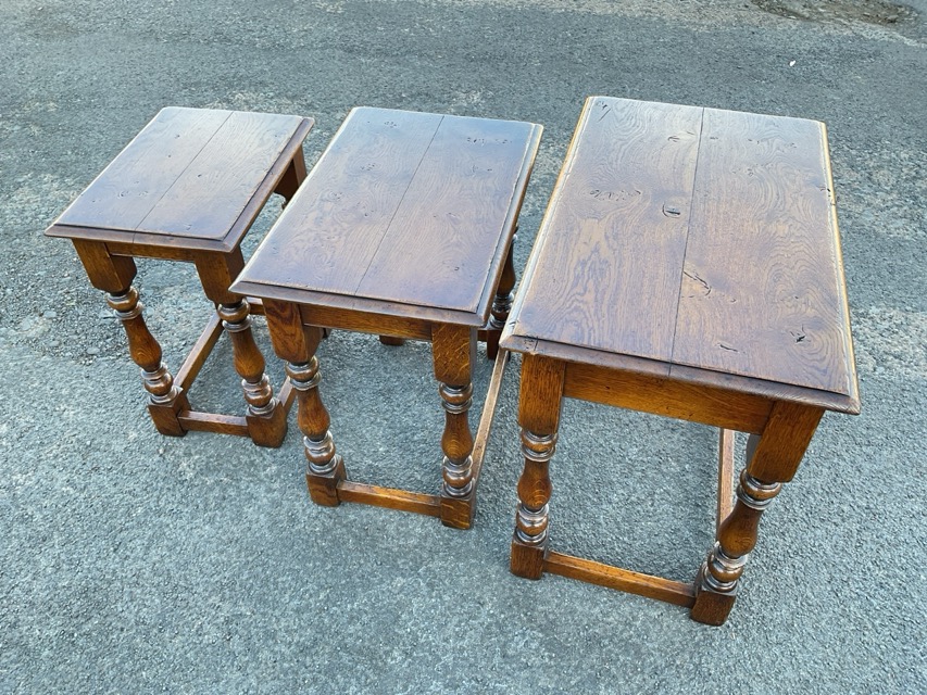 A nest of three oak tables with moulded rectangular tops, above frieze carved with floral medallion in lozenge, raised on turned legs with block feet. (3)