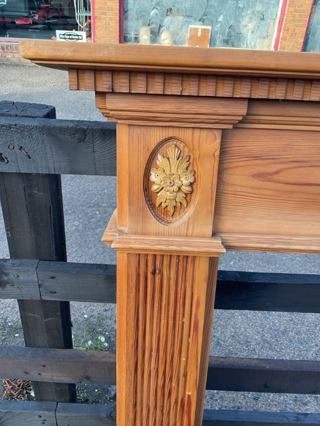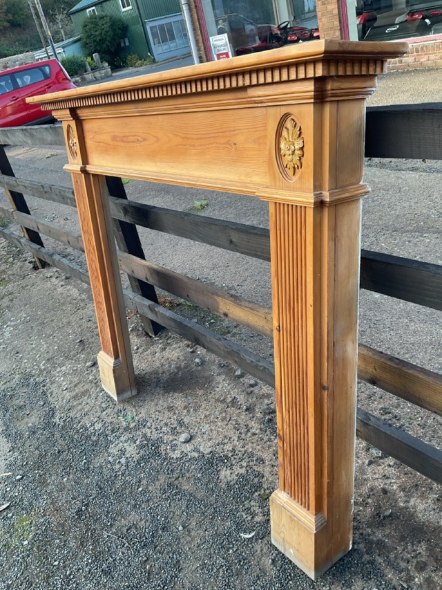 A contemporary Georgian style pine chimney-piece, the dentil moulded mantle above floral medallions, raised on square reeded columns. (54.25in x 8in x 46in)