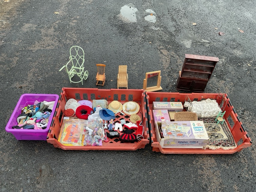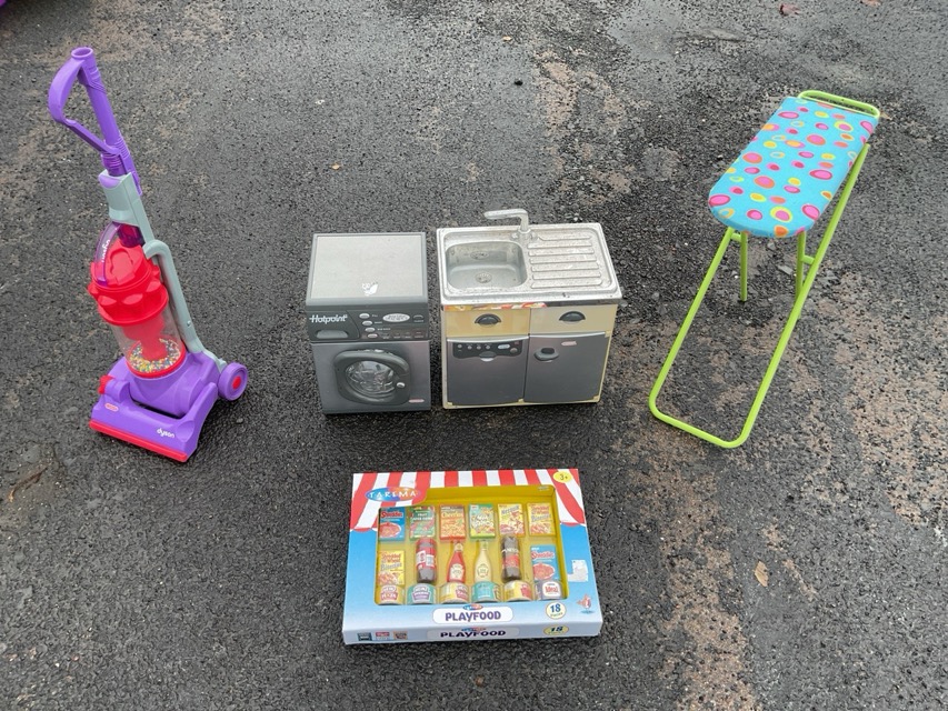 Miscellaneous dolls furniture, toys & accessories - a Dyson hoover, a hotpoint kitchen set, playfood kit, a boxed little hostess dining table and chairs, a wirework bed, sideboard, dressing table, rocking chairs, a rug, Bratz, dolls clothing & hats, etc. (A lot)