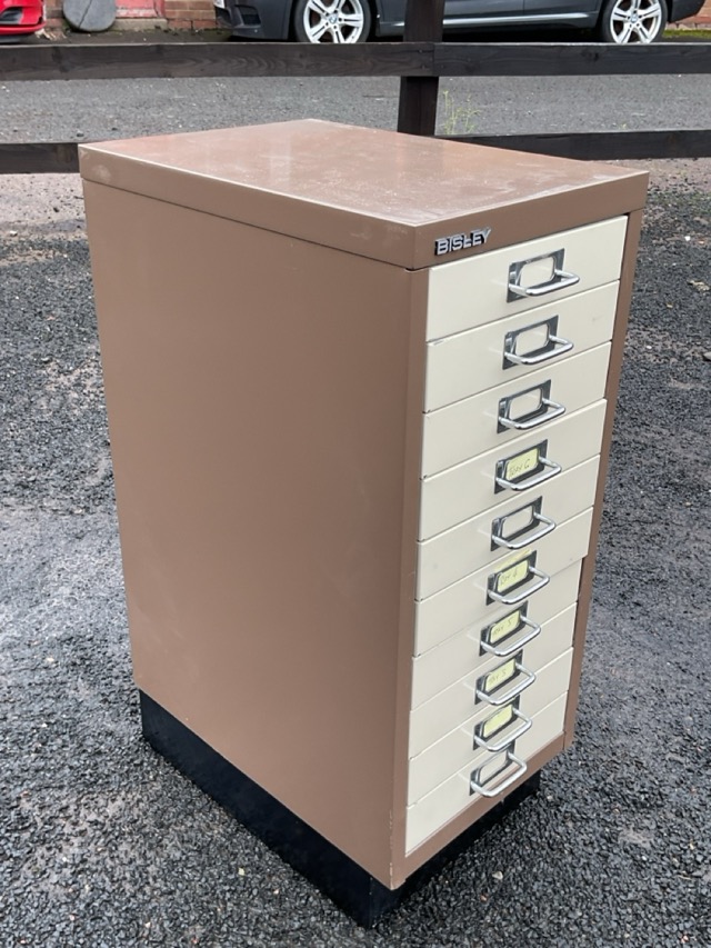 A Bisley collectors cabinet of ten drawers mounted with chromed label tubular handles, above recessed plinth. (11in x 16in x 26.5in)