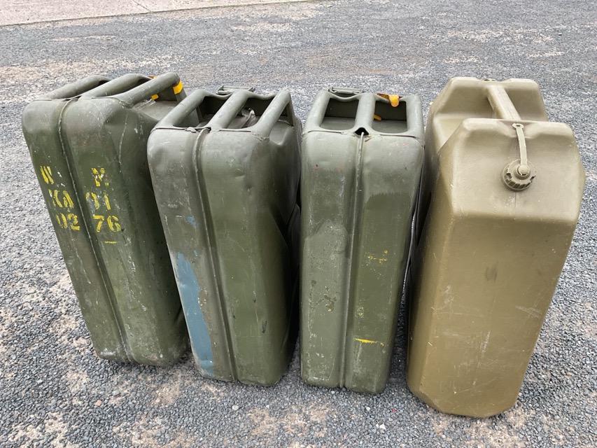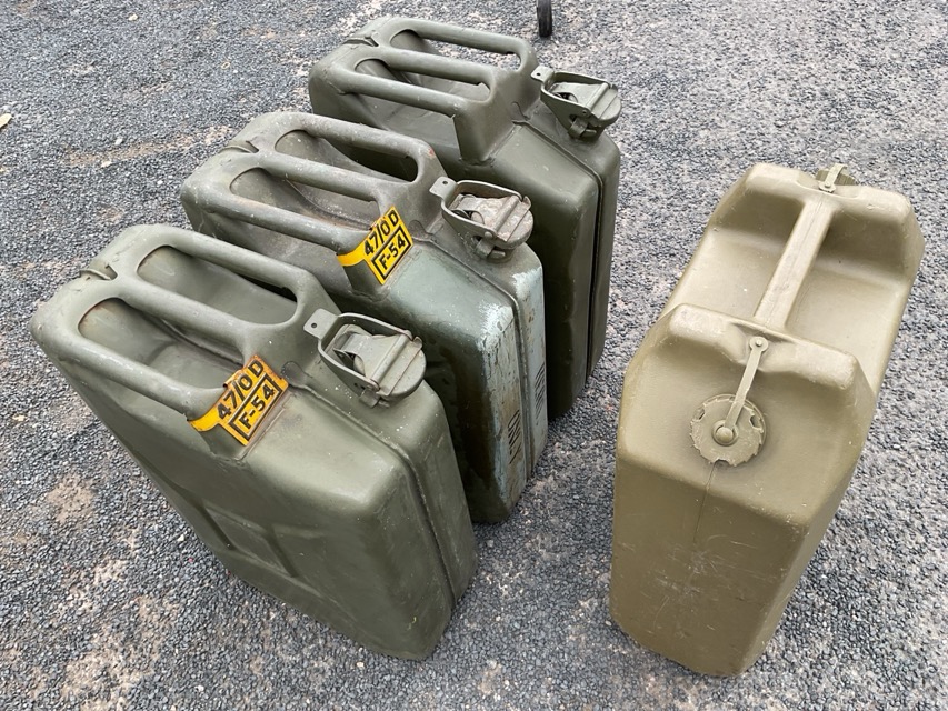 Three fuel jerry cans dated 1966 & 1975; and a 1970 water container. (4)