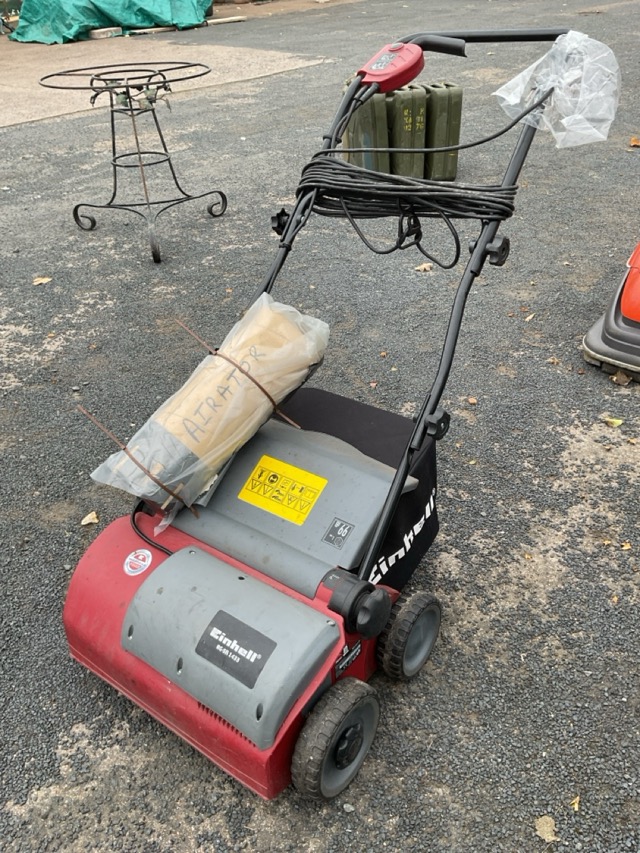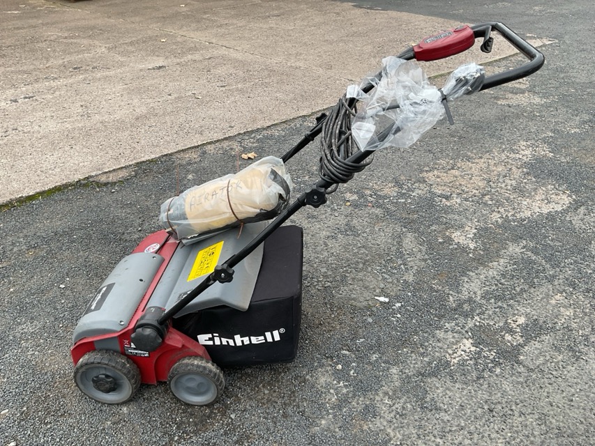 An Einhell electric garden scarifier/airator with adjustable wheels, long cable, fabric grassbox, etc.