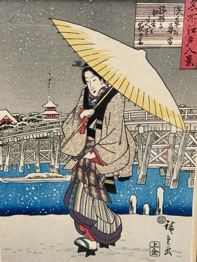 Utagawa Hiroshige, a pair of C20th Japanese woodblock reprints from the series Eight Scenic Views of Mount Ohmi, depicting the Mii temple & Awazu, signed, mounted & framed; and another reprint by the same artist depicting a lady in the snow at Asakusa. (3)