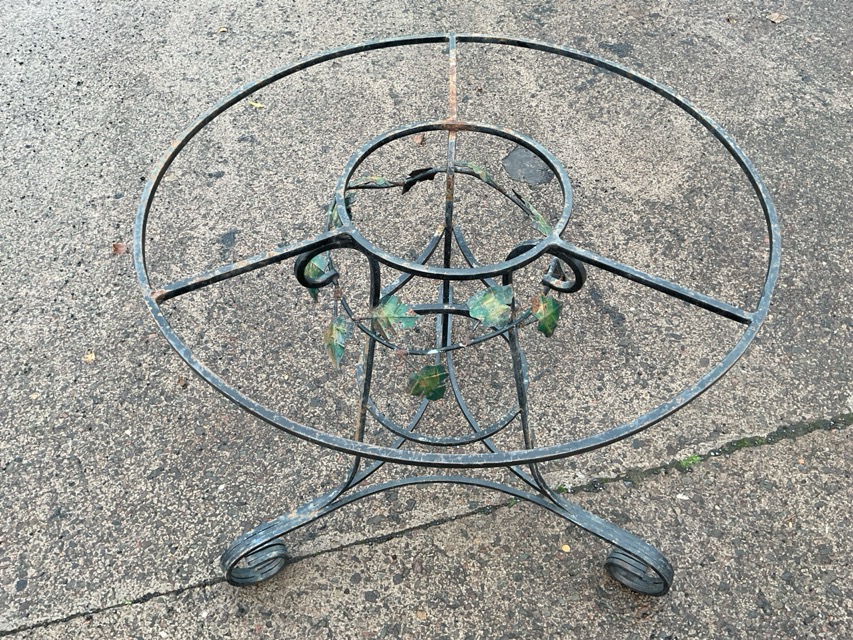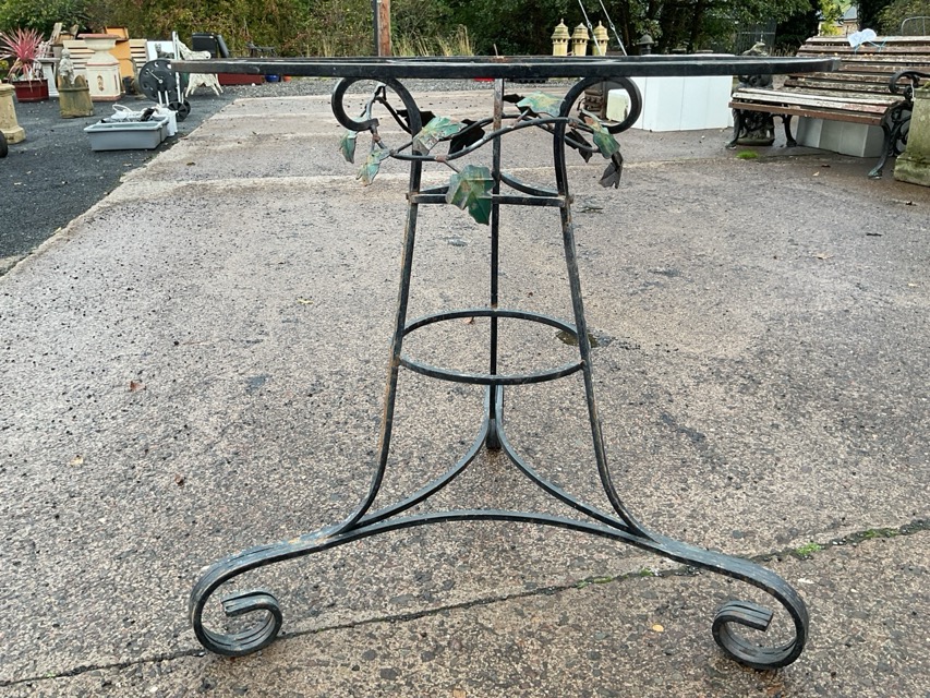 A circular wrought iron table base or pot stand, the top with ivy leaf decoration on three scrolled legs. (28in x 26.75in)