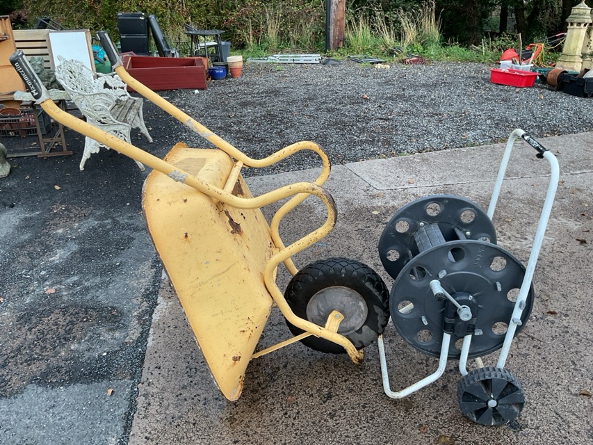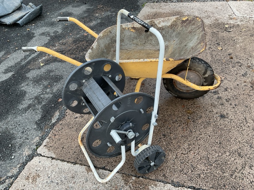 A garden hose reel trolley with drum on tubular frame and wheels; and a painted Haemmerlin builders wheelbarrow. (2)