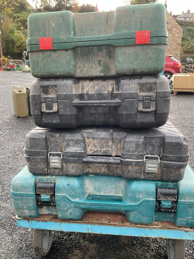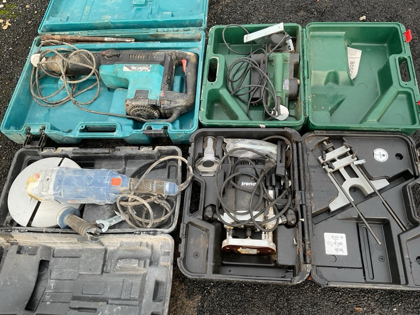 Four cased power tools - a Bosch planer, a Makita hammer drill with bits, a Dexter angle grinder/cutter and a Trend router. (4)
