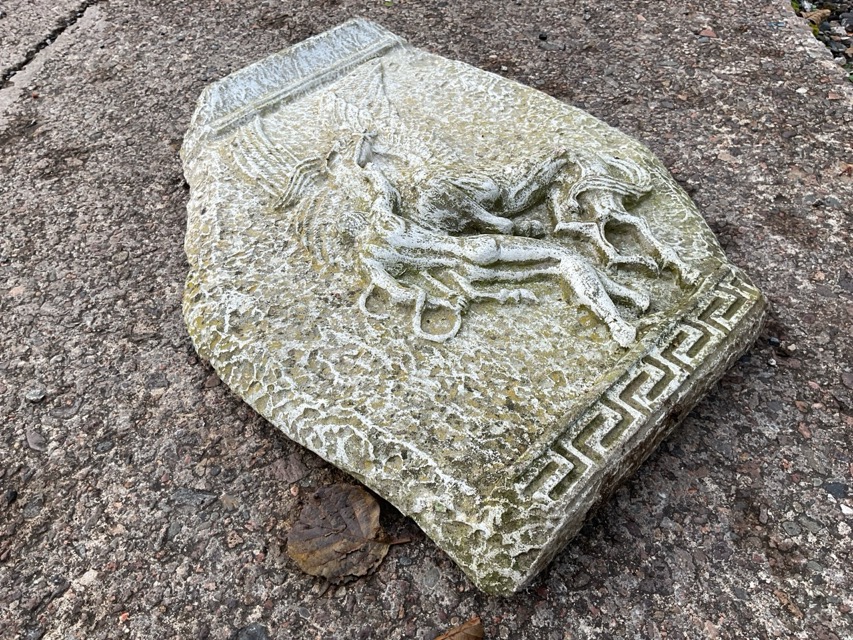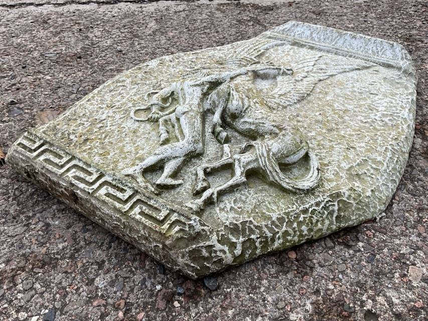 A composition stone garden panel after the antique Roman frieze, the fragment with Pegasus and figure above greek key band. (18in)